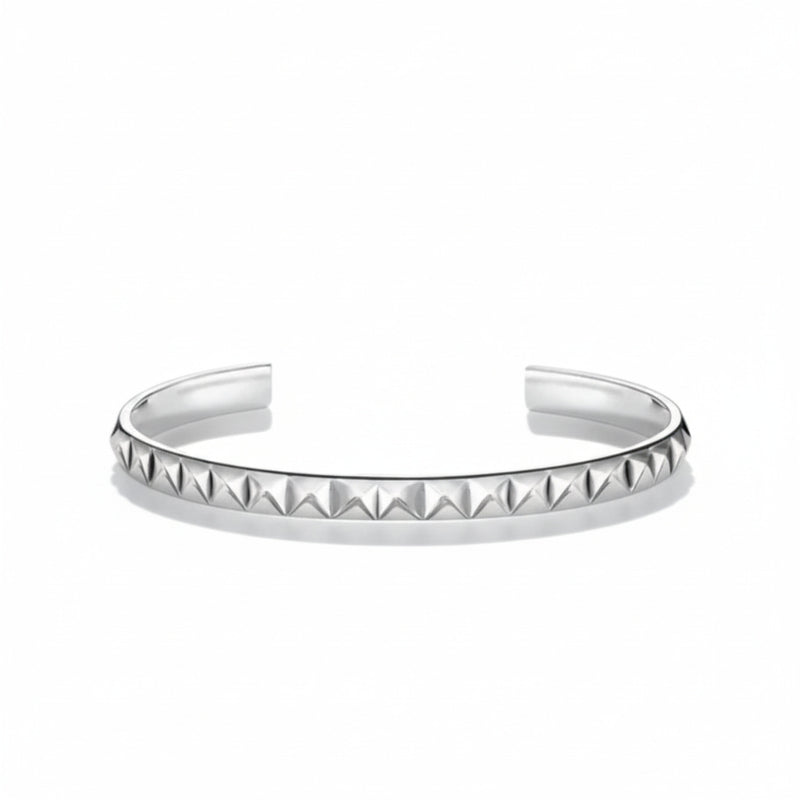 A solid sterling silver cuff bracelet featuring a continuous row of 6mm pyramid studs. Its minimalist geometric design is bold yet versatile.