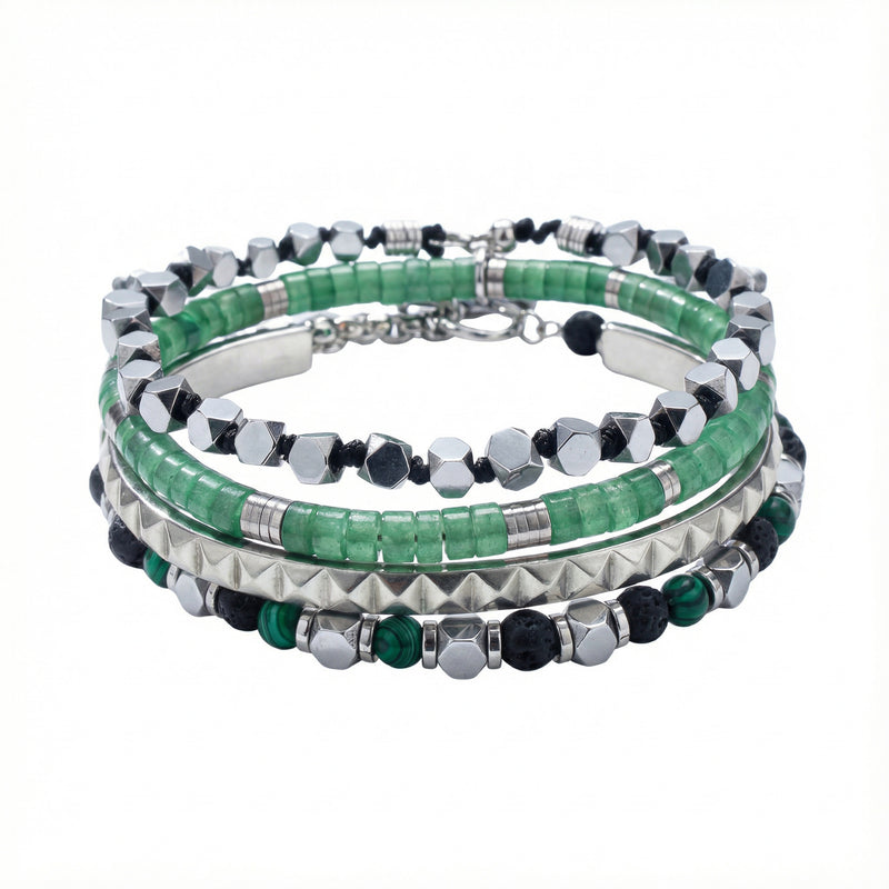 Fifty Cubes Boxchain 925 Sterling Silver Bracelet | Black Lava Stone & Green Aventurine Heishi Beads | Mia Collection