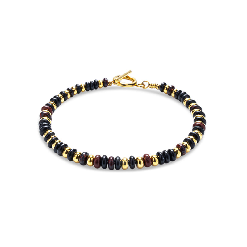 This Mia bracelet is made with Black Onyx & Mahogany Obsidian heishi beads. The 4mm heishi beads are shaped into smooth, river stone-like plates, elegantly separated by 14K gold-finished discs & a chic T-bar hoop clasp. Wear it to build a captivating stack or let it command attention on its own.