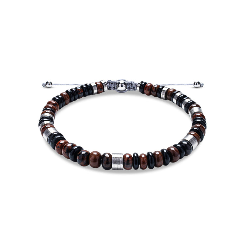 This bracelet is made with Black Onyx & Mahogany Obsidian heishi beads. The 6mm beads are shaped into smooth, river stone-like discs, elegantly separated by polished 925 sterling silver plates & lock ball.