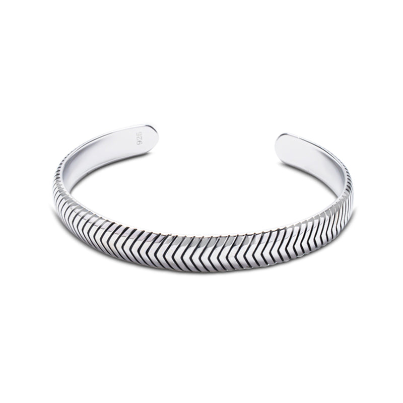 This 8mm cuff is made from solid 925 sterling silver, its rounded form is defined by a continuous, herringbone V-shaped pattern that creates a captivating play of light and shadow.