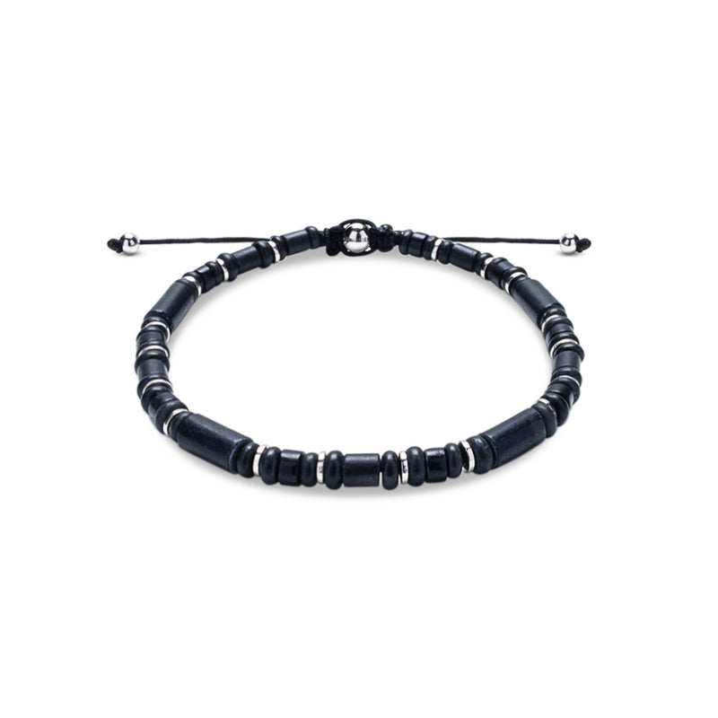 This bracelet is made with Black Agate heishi beads, paired with smooth Black Onyx river stone shaped beads and polished 925 Sterling Silver discs. The beads are strung on a resilient luxe-nylon cord and secured with an adjustable drawstring closure and a sterling silver lock ball.