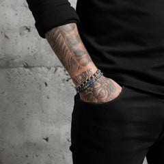 This bracelet is made with 4mm Lapis Lazuli and Ash Grey Moonstone ball heishi beads punctuated with 925 sterling silver discs. It's finished with a secure lobster clasp and multiple size adjusters for a precise custom fit. Wear it to anchor a stack of Vicious Jewels pieces or let it command attention on its own.