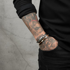 This bracelet is made with Tiger Eye, Cream Jade and Howlite ball heishi beads punctuated with 925 sterling silver discs. It's finished with a secure lobster clasp and multiple size adjusters for a precise custom fit. Wear it to anchor a stack of Vicious Jewels pieces or let it command attention on its own.